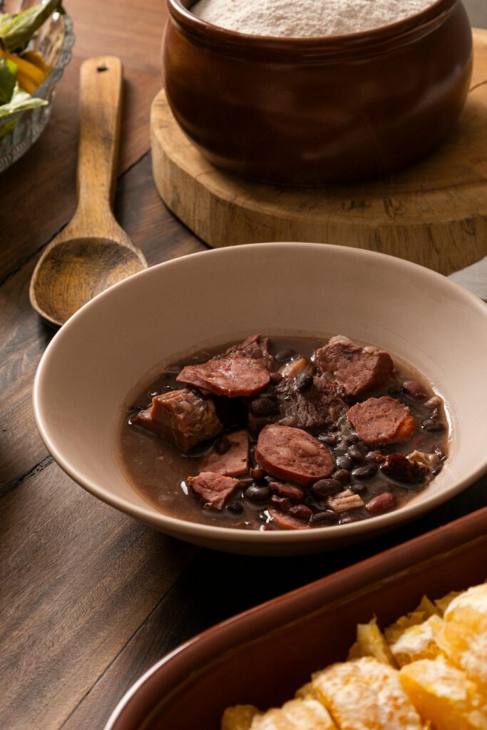 Feijoada is a traditional Brazilian stew made primarily with black beans and a variety of pork cuts, such as sausages, ribs, and smoked or salted meats. To prepare it, the beans are slowly cooked with the meats, onions, garlic, and bay leaves until the flavors meld into a rich, savory broth.